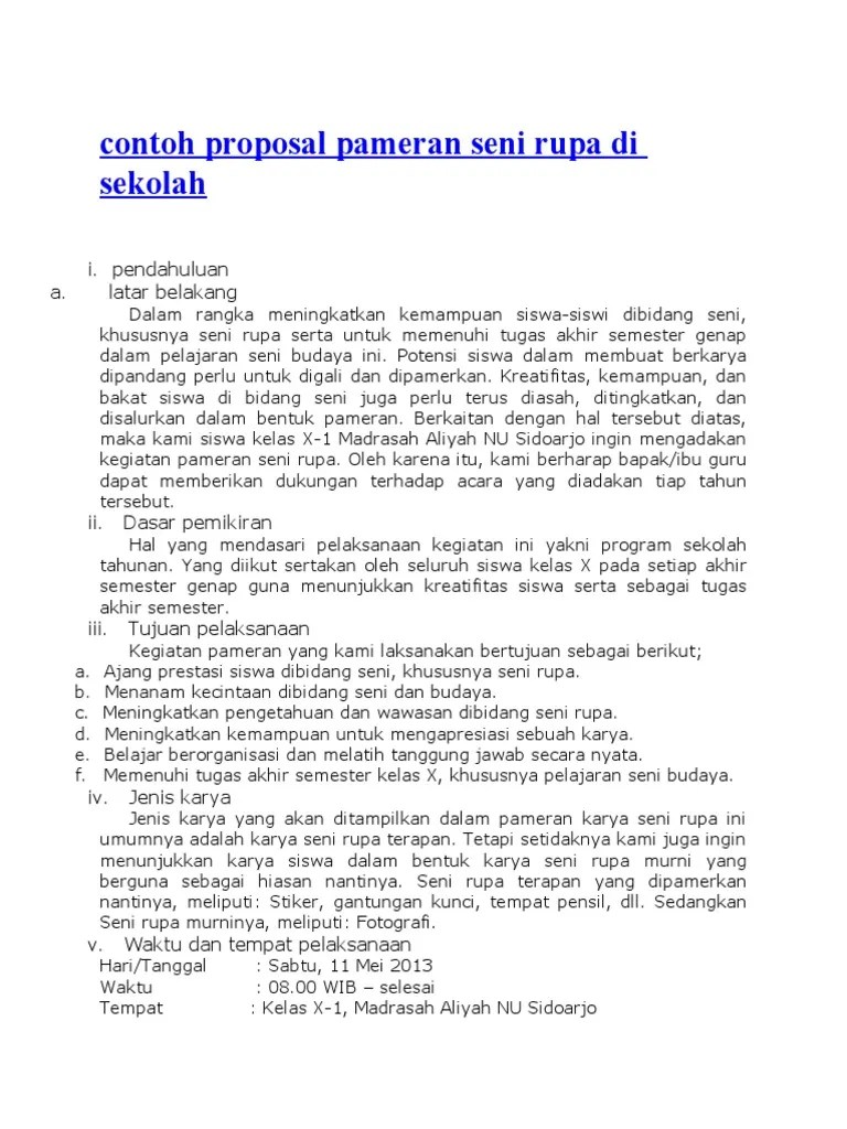 Seni rupa merupakan cabang seni yang membentuk karya seni. Menyusun proposal kegiatan pameran karya seni rupa merupakan salah satu syarat dan bagian dari perencanaan sebelum melaksanakan kegiatan pameran. Media yang dimaksud merupakan sesuatu yang bisa ditangkap mata dan. Di dalam proposal ini kami memaparkan semua yang berhubungan dengan penyelenggaraan pameran seni rupa. Memberikan wadah bagi siswa untuk berekpresi dan berkreasi seni. Kami anak muda, kami berkarya. Dalam kesempatan kali ini saya akan bagikan sebuah proposal yang bertemakan pensi (pentas seni) dengan judul pameran seni rupa dilingkungan perguruan tinggi (kampus) secara gratis. Contoh proposal seni budaya ( pameran seni ). Untuk itu, galeri cheum memiliki ide untuk membuat pameran seni rupa ini. Proposal seni rupa ini disusun berdasarkan bimbinga dari bapak h. Reza aryaraj regina oleh karena itu, kami berharap bapak/ibu guru dapat memberikan dukungan terhadap acara yang di selenggarakan oleh kami. Tasikmalaya januari 2016 ketua pelaksana. Latar belakang, tema, nama kegiatan.