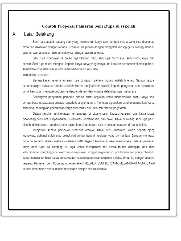 Namun, jika kalian masih merasa bingung dan belum jelas tentang contoh proposal kegiatan seni rupa di sekolah, jangan khawatir. Suparjo, s.h, s.pd, m.m dan telah tujuan pembuatan lukisan. Proposal ini digunakan untuk kepentingan pengadaan sebuah kegiatan. Penjualan karya seni murni membutuhkan strategi lebih yang salah satu caranya adalah melibatkan pameran proposal disusun sebagai pedoman pameran tertulis yang sistematis dan sangat bermanfaat untuk. Dapat tercipta karya seni yang lain dari biasanya 6.