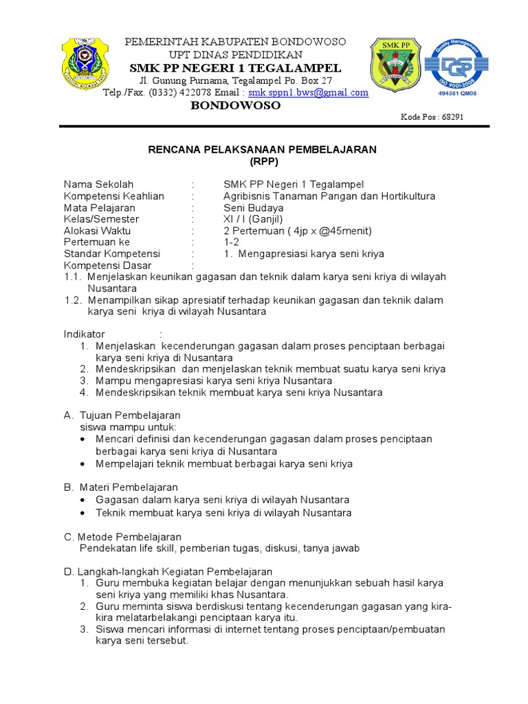 Pada kesempatan kali ini aku bakal membagikan perangkat silabus sekolah menengah kejuruan (smk) dengan jurusan seni budaya kelas x yang didalamnya telah dilengkapi mulai dari. Rpp 1 lembar seni budaya (seni rupa) kelas 11 sma/ma semester 1 , rpp 1 lembar merupakan rpp yang disederhanakan sebagai wujud implementa. Contoh rpp bahasa jawa smk kelas 10 semester gasal. Memeragakan dinamik kuat dan lemahnya secara sederhana irama. Rpp seni budaya semester2 kls x. Sebagai referensi buat saja rpp 1 lembar dengan format sederhana sesuai kebutuhan. Jika saat ini sedang membutuhkan kerangka silabus seni budaya k13 tingkat smp kelas 7 semester 1 dan semester 2, bisa langsung download di artikel ini bagian bawah. Rpp dan silabus seni budaya smp kelas vii, viii, ix lengkap kurikulum ktsp program semester (promes), program tahunan (prota), pemetaan, dan kkm. Pada kesempatan kali ini, saya akan berbagi materi matematika kelas 7 semester 2, yaitu tenta. Mungkin itu saja saat ini informasi paling update dari admin mengenai salah satu komponen perangkat pembelajaran k13 smp/mts untuk penulisan rpp sudah admin sediakan. Perangkat pembelajaran guru rpp 1 lembar 2020 k13 smp bahasa indonesia. Soal seni budaya,,, hal ini merupakan salah satu upaya yang terdapat pada pelajaran sekolahan menengah atas sma/ma/smk dan dalam baca juga: Teknik komposisi biasanya dikaitkan dengan.